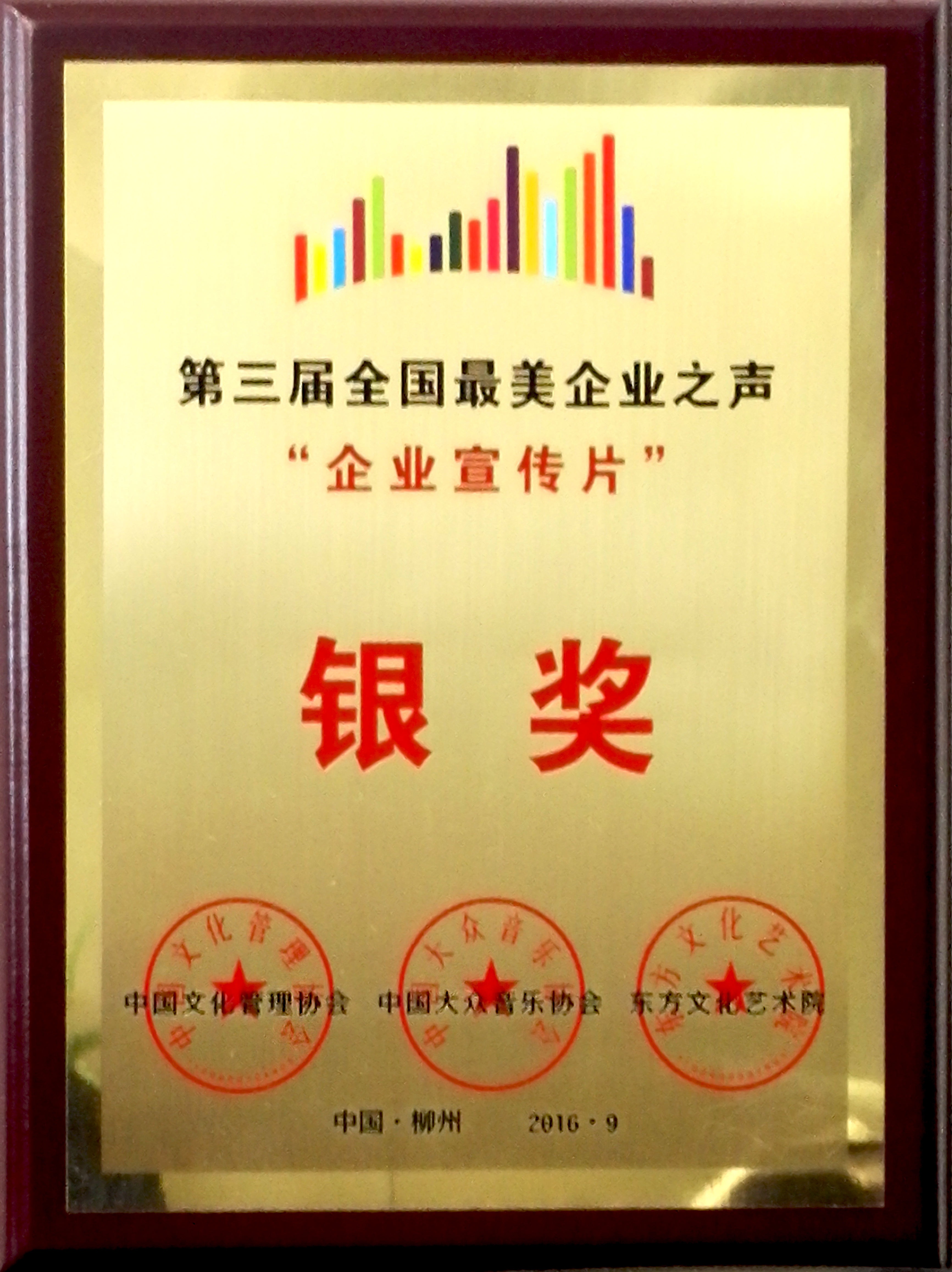 928日至29日,中國文化部直管的中國文化管理協會在柳州召開會議。會上,發布了“中國企業文化建設測評標準3.0”,對全國企業文化建設工作、企業歌曲、企業宣傳片等方面的先進進行了表彰。集團公司獲得“企業黨建文化十強單位”,集團公司精心設計制作的企業宣傳片《品質工業,精誠投資》,在全國選送參評的400余部宣傳片中脫穎而出,獲得銀獎。
