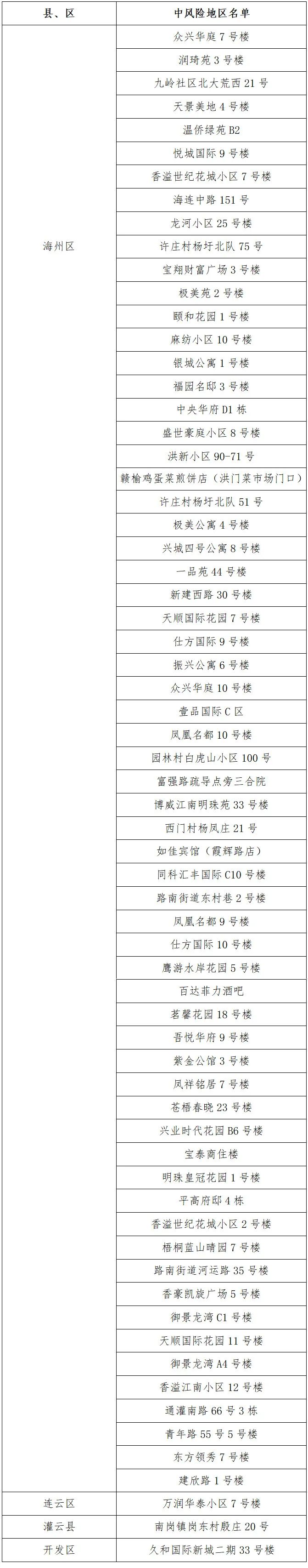根據國務院聯防聯控機制有關規定,經綜合評估研判,市指揮部決定,自發布之日起,將海州區茗馨花園18號樓、吾悅華府9號樓、紫金公館3號樓、鳳祥銘居7號樓、蒼梧春曉23號樓、興業時代花園B6號樓、寶泰商住樓、明珠皇冠花園1號樓、平高府邸4棟、香溢世紀花城小區2號樓、梧桐藍山晴園7號樓、路南街道河運路35號樓、香豪凱旋廣場5號樓、御景龍灣C1號樓、天順國際花園11號樓、御景龍灣A4號樓、香溢江南小區12號樓、通灌南路66號3棟、青年路55號5號樓、東方領秀7號樓、建欣路1號樓調整為中風險地區。