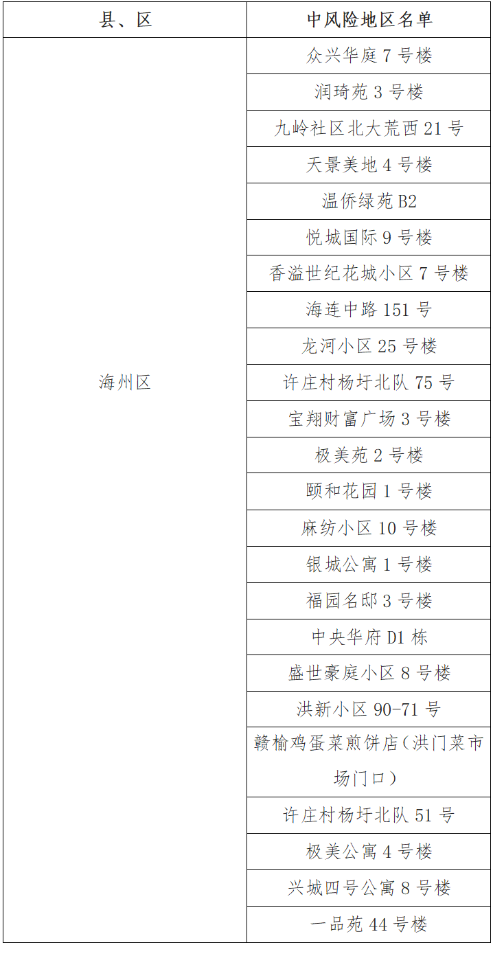 根據國務院聯防聯控機制有關規定,經綜合評估研判,市指揮部決定,自發布之日起,將頤和花園1號樓、麻紡小區10號樓、銀城公寓1號樓、福園名邸3號樓、中央華府D1棟、盛世豪庭小區8號樓、洪新小區90-71號、贛榆雞蛋菜煎餅店(洪門菜市場門口)、許莊村楊圩北隊51號、極美公寓4號樓、興城四號公寓8號樓、一品苑44號樓調整為中風險地區。其他地區風險等級不變。調整后全市現有24個中風險地區。