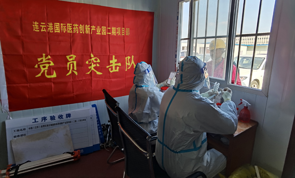 “請大家保持一米線,戴好口罩,有序參與核酸檢測,謝謝配合!”來自市級重大項目連云港國際醫藥創新產業園二期項目黨員突擊隊的成員席時棟、陳家輝喊道。據悉,該項目目前按照上級相關規定,實行閉環管理,做好相關疫情防控工作?!拔覀冺椖坎繃栏癜凑帐小㈤_發區相關規定,做好閉環施工,疫情防控、項目建設兩手抓、兩手硬。”來自集團棚戶區改造裕源三期項目負責人青年黨員徐震說道。