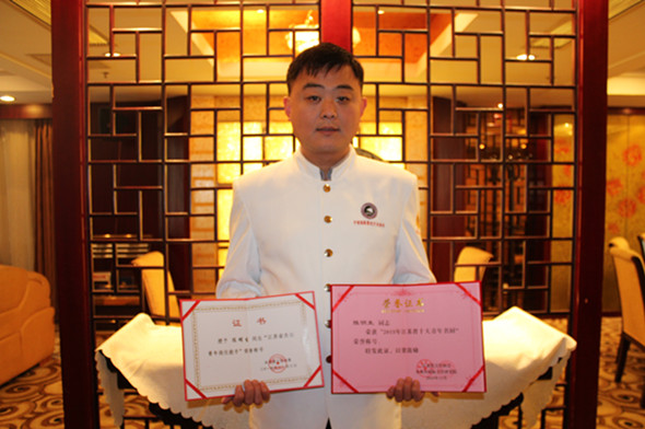 由共青團江蘇省委員會、江蘇省烹飪協會聯合舉辦的2015年度“江蘇省十大青年名廚”評選活動的結果,日前在蘇州開幕的江蘇省第二屆廚師節上揭曉,淮鹽大酒店廚師長陳明生被評為“江蘇省十大青年名廚”,他還同時被共青團江蘇省授予“江蘇省青年崗位能手”稱號。此次活動參評選手須是江蘇省烹飪大師或江蘇省烹飪名師以上,具有技師或高級技師技術職稱,且年齡在35周歲以下的青年廚師。由專家評審團根據選手參加賽事獲獎情況及為全省或地方等方面進行綜合評估,最終評出江蘇省十大青年名廚。(陳明生)