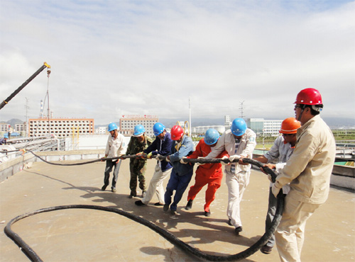 此項工程線路鋪設需經過300多米地下頂管、200多米的空中橋架和多個電纜井。較之以往施工難度更大:一是高空作業多,施工進度難以把握;二是人員負荷大,電纜需穿過多處交叉橋架,工程機械不能較好的發揮作用,大量的工作需要人力完成;三是天公不作美,從30日開始,陣雨雷雨不斷,現場施工人員的衣服也多次濕透。
