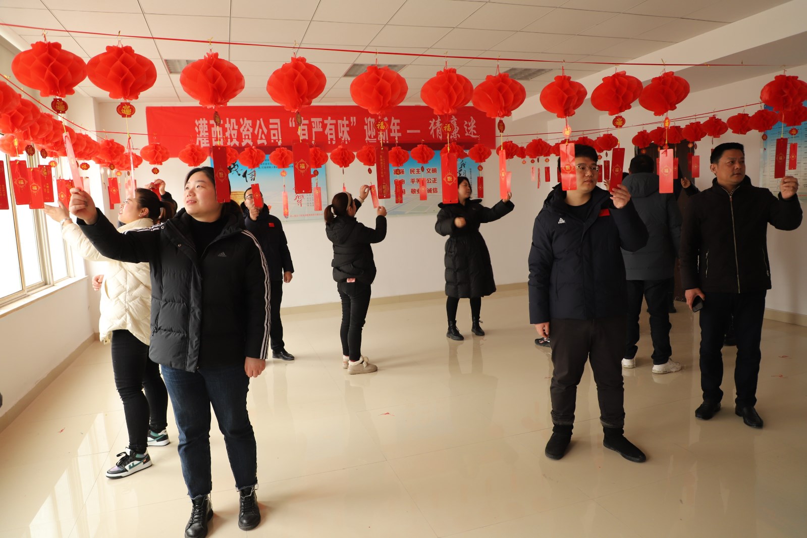 “樹我中華廉政風——打我國兩節氣。”“反腐倡廉常抓不懈——打一中國地名。”1月27日,灌西投資公司辦公大樓廉政文化展廳內紅紅的燈籠格外喜慶,近百條廉政燈謎依次懸掛,一場集知識性和趣味性于一體的廉政燈謎有獎競猜活動吸引了百余名員工聚集參與,大家一起開動腦筋,爭相“解密”。