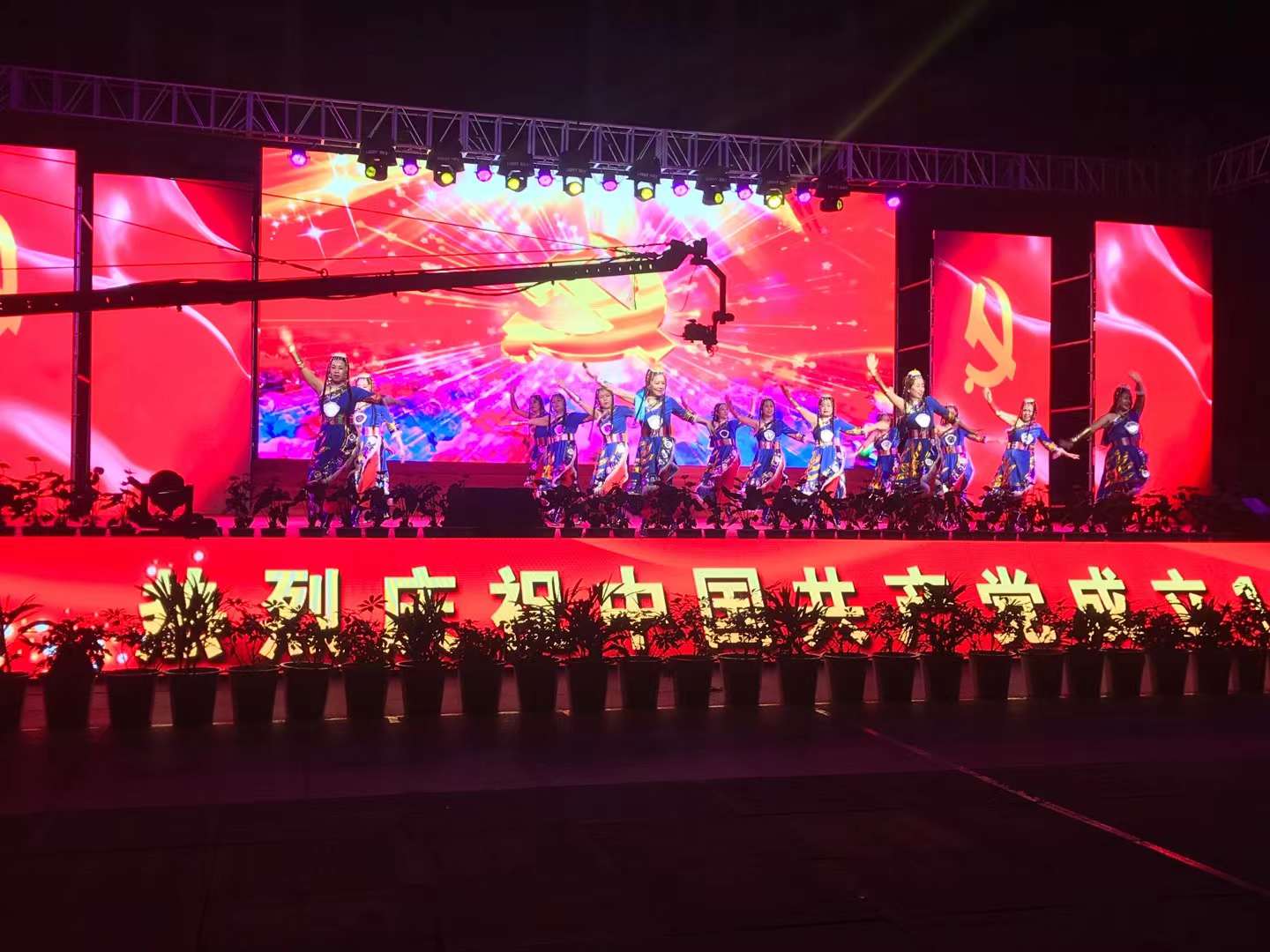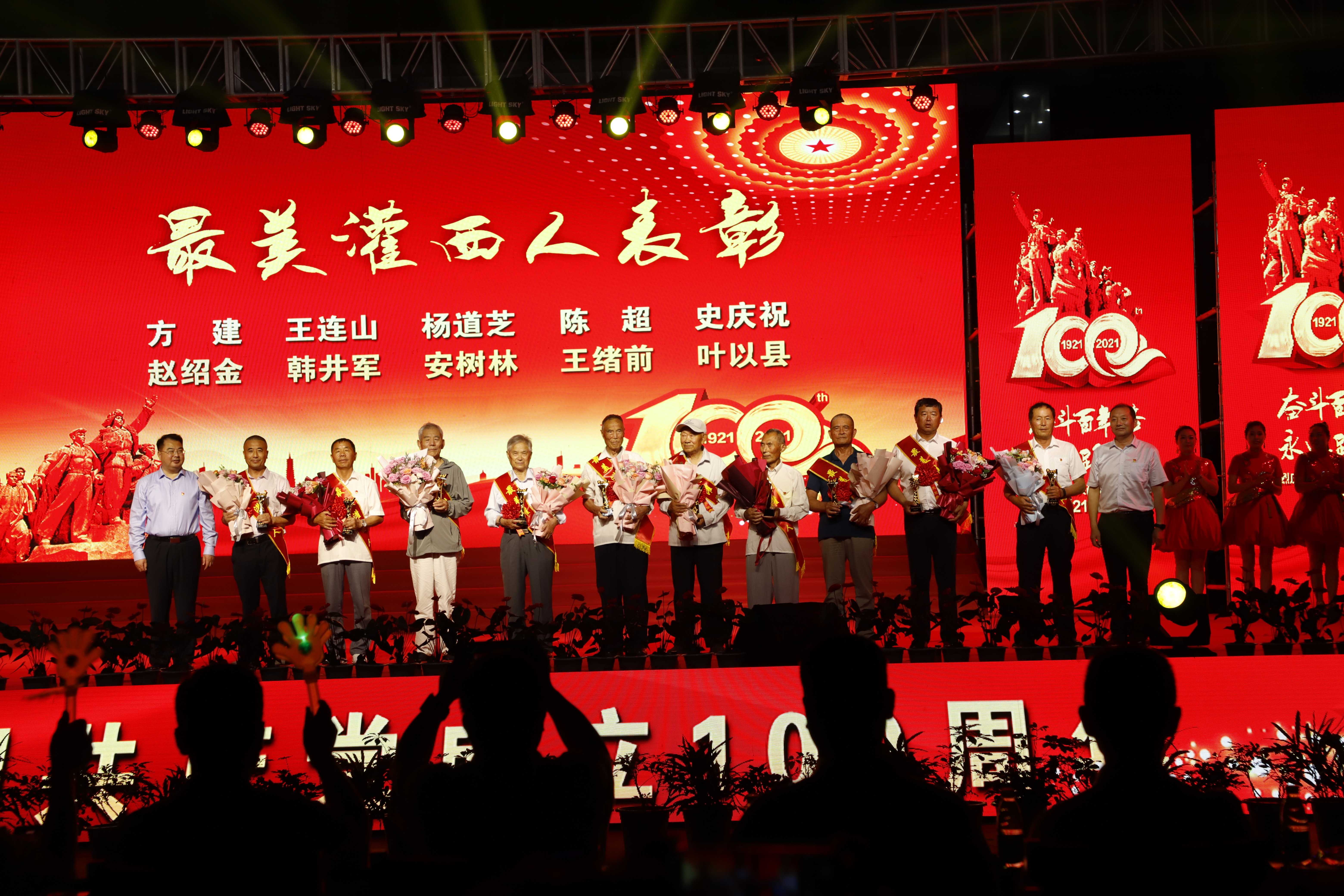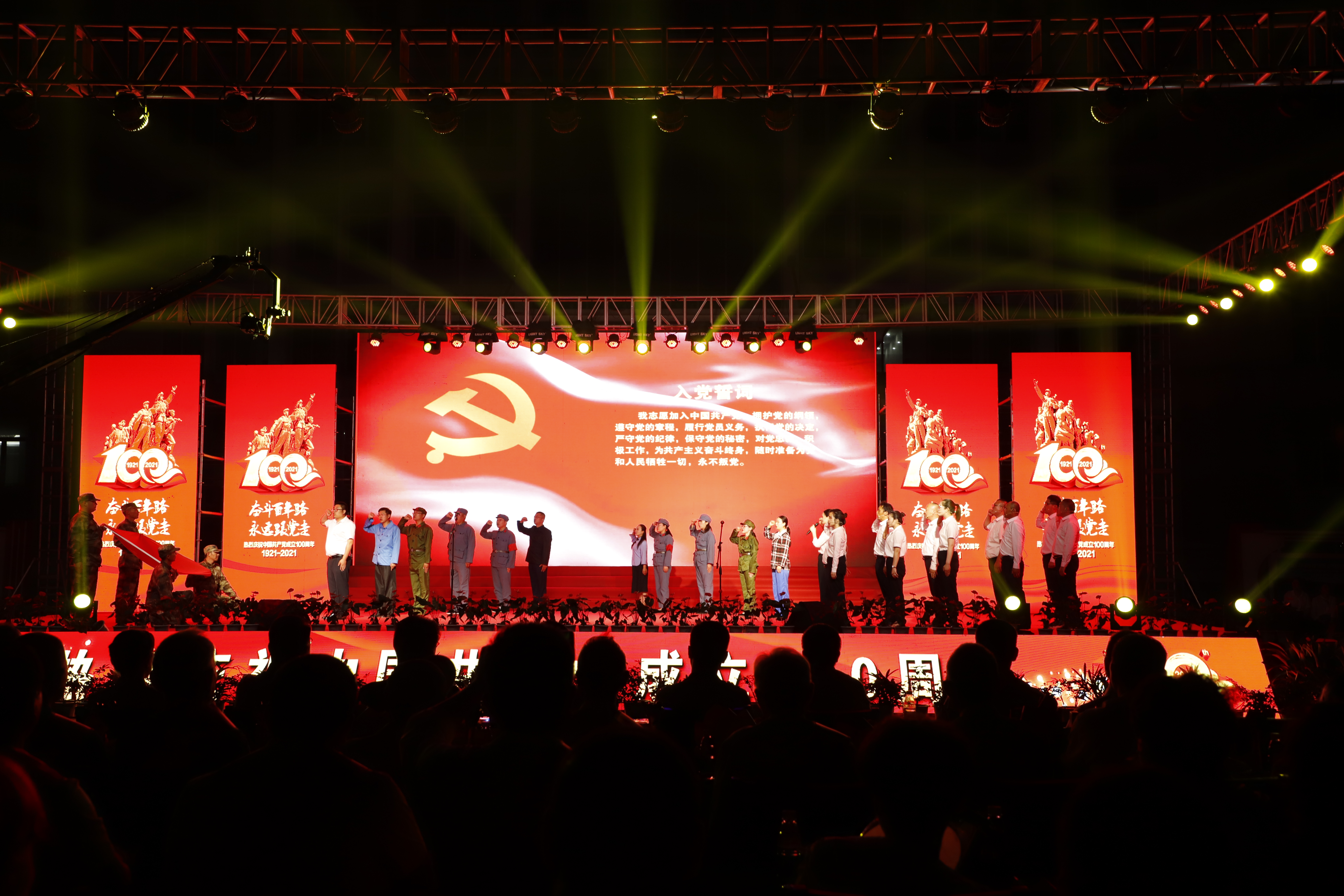 百年征程路漫漫,燦爛輝煌激人心,是中國(guó)共產(chǎn)黨指給了人民解放的道路,領(lǐng)導(dǎo)中國(guó)走向光明,是中國(guó)共產(chǎn)黨引領(lǐng)中華民族走向復(fù)興之路,奮進(jìn)新時(shí)代、開(kāi)啟新征程,最后,全場(chǎng)人員同唱《沒(méi)有共產(chǎn)黨就沒(méi)有新中國(guó)》,10面國(guó)旗、10面黨旗在揮舞,整個(gè)舞臺(tái)成為一片紅的海洋,整場(chǎng)晚會(huì)圓滿落下帷幕。
