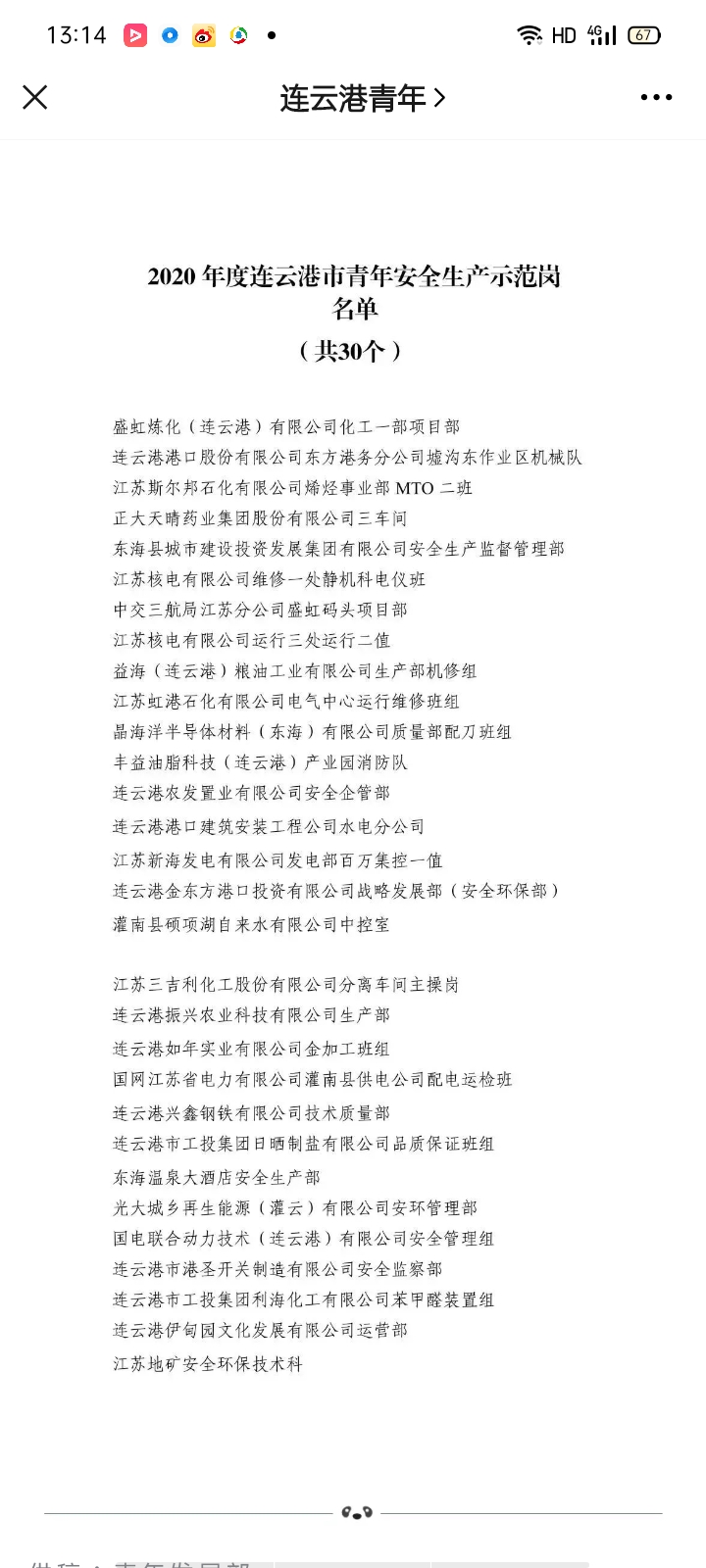 1112共青團連云港市委員會公布2020年度連云港市青年安全生產(chǎn)示范崗名單,連云港市工投集團日曬制鹽公司品質(zhì)保證班組被評為2020年度連云港市青年安全生產(chǎn)示范崗。