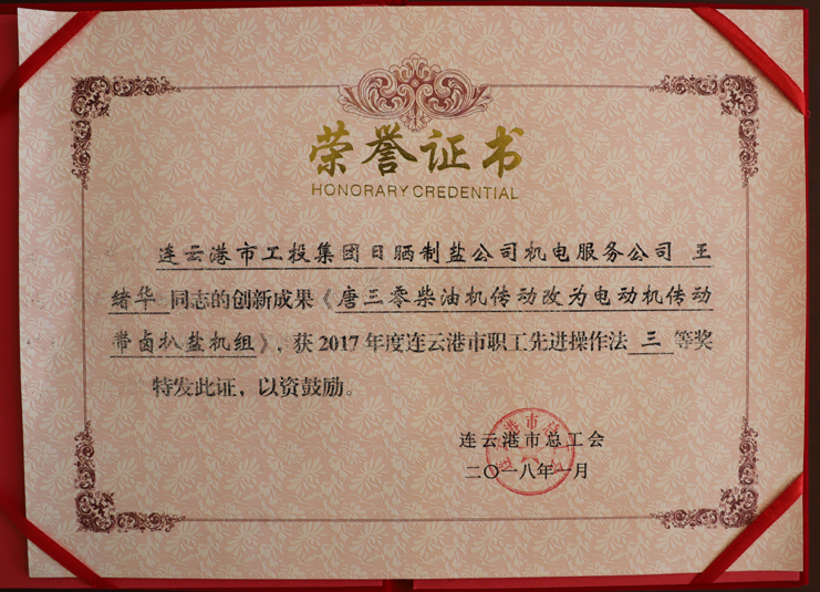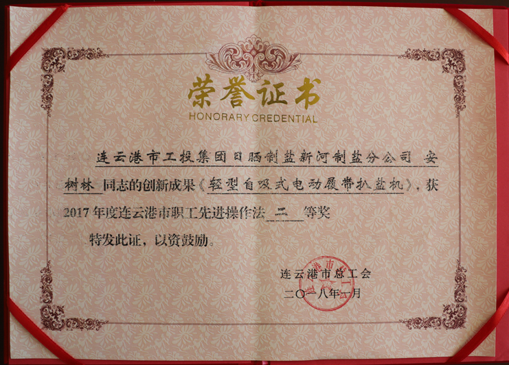 近日,日曬制鹽新河制鹽分公司安樹林同志的創新成果《輕型自吸式電動履帶扒鹽機》,被市總工會評為2017年度連云港市職工先進操作法二等獎,日曬制鹽公司機電服務公司王緒華同志的創新成果《唐三零柴油機傳動改為電動機傳動帶鹵扒鹽機組》,被市總工會評為2017年度連云港市職工先進操作法三等獎。(西工)