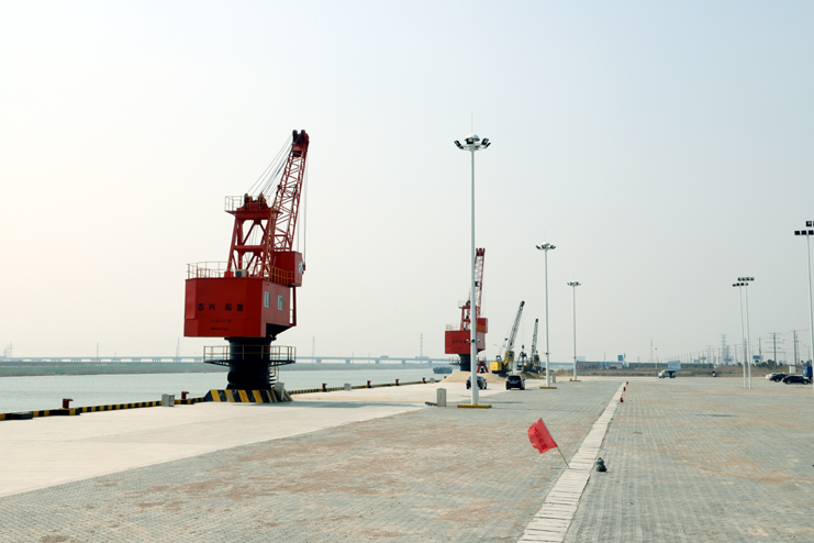 在五灌河碼頭現場,302米長的碼頭平臺上,2座20多米高的紅色座吊一字排開,在河水的映照下顯得格外“威武”。據碼頭工作人員介紹,這兩座吊機剛剛安裝并調試完畢,它們是五灌河碼頭運營的最基本條件之一,一座25噸,另一座40噸,運出貨物將通過這兩座吊機完成。