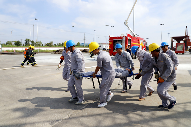 此次演練模擬電器短路和起火事故開展應急救援。碼頭現場吊機在操作中發生主電機電流過載,配電箱出現異常,吊機作業操作無法正常工作,主機發出報警,吊機剎車系統出現失靈,電器設備出現故障,繼而發生初期電火,報警信號發出后30秒內該區域內所有人員疏散完畢,并撥打119火災救援電話,并迅速遏制火情,撲滅火災,有效保護在場人員人身安全及公司財產安全。整個演練過程,參演員工嚴格按照應急預案要求,積極配合,有序、迅速地完成疏散及滅火等演練任務,人員及財產得到了有效保護,演練達到了預期效果。