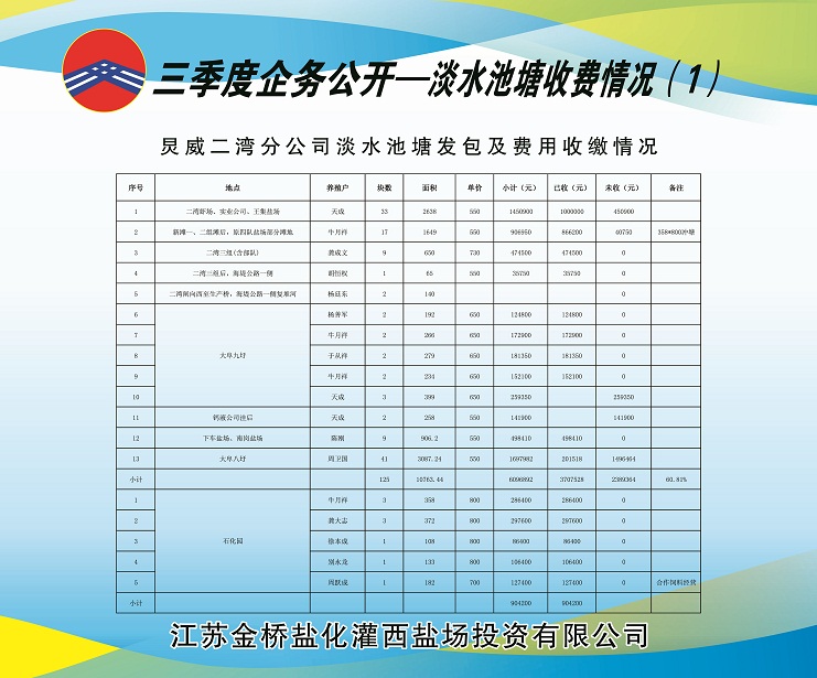 (二)淡水養殖池塘發包及費用收繳情況:共發包淡水養殖池塘210塊,面積21574.14畝,應收租賃費1420.5612萬元,已收租賃費1170.2558萬元,欠收租賃費250.3054萬元,收繳率為82.38%,正在加緊催收中。