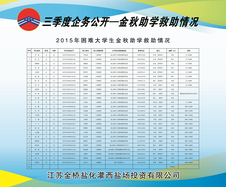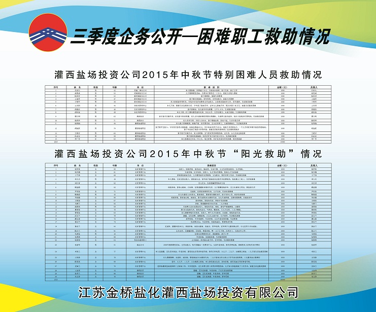 三季度,公司黨委積極做好走訪慰問、送溫曖工作,灌西鹽場投資公司、日曬制鹽公司對30名困職工發放陽光救助金30000元;對15名患重大疾病困職工及直系親屬發放救助金15000元;對26名困難大學生實行金秋助學金67000元。具體情況請查看公示展板。