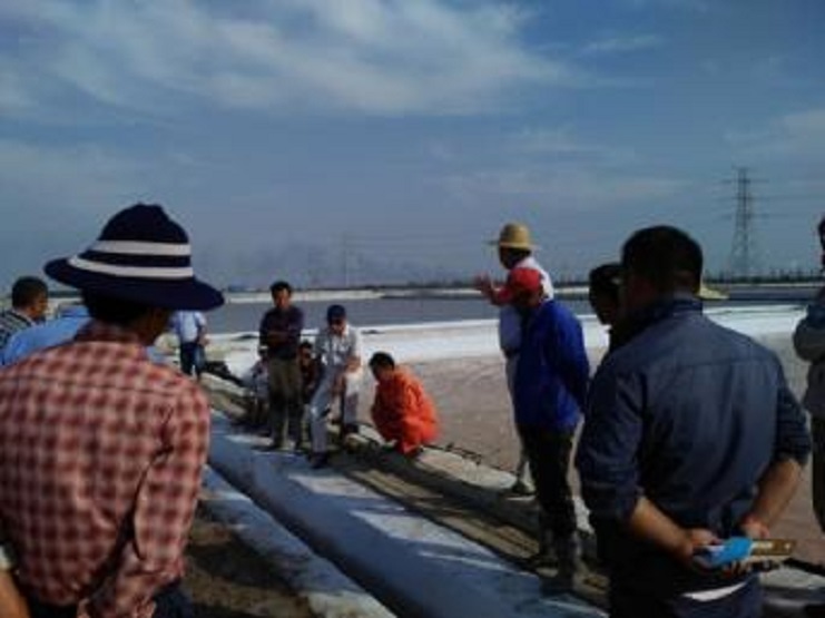 該分公司一班人帶著十六名班長,到新河零班做加鹵“天溝”工作現(xiàn)場。剛到目的地,站在打好的溝頭,一眼望去,二條溝口線筆直,和熟捯實的粘埝泥輕而易舉承載著人的重量。此條加鹵“天溝”嚴(yán)格按日曬制鹽公司規(guī)格標(biāo)準(zhǔn)而建,溝長約210米,上口寬55cm,下口寬30cm,溝深45cm,溝底坡勢順沿三排到頭排由淺至深。做好的一條加鹵溝, 可以為六塊結(jié)晶池扒鹽期間分別添加鹵水,減少洗鹽鹵水進(jìn)其它池塊的二次污染。
