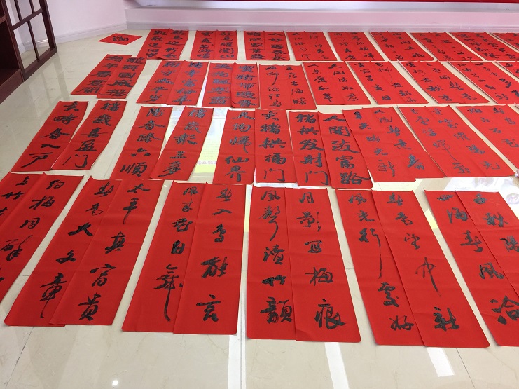 此次活動(dòng)共邀請了3位書法愛好者為職工免費(fèi)寫春聯(lián)、贈(zèng)春聯(lián),紅色的春聯(lián)和熱鬧的人群將活動(dòng)現(xiàn)場映襯得年味十足。書法愛好者們飽含熱情,擺開書案,攤開宣紙,揮毫潑墨,將真誠的祝福賦諸筆端。宵洋物流的職工們紛紛趕來現(xiàn)場排隊(duì)幫忙,互相談?wù)撝鞲贝郝?lián)的寓意,有的根據(jù)新年心愿從準(zhǔn)備好的春聯(lián)中精心挑選特邀書寫,有的期望書法愛好者為其精心定制現(xiàn)場創(chuàng)作。濃濃的情意、真摯的祝福溢于字里行間,大家拿著一幅幅寓意喜慶,飽含祝福的春聯(lián),喜笑顏開,不停表達(dá)著對(duì)灌云縣海事局和縣書法協(xié)會(huì)的感謝。(宵洋物流 邱利民)