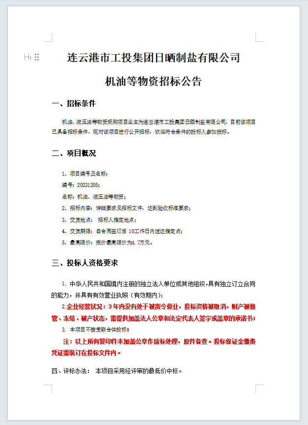 連云港市工投集團日曬制鹽有限公司機油等物資招標公告