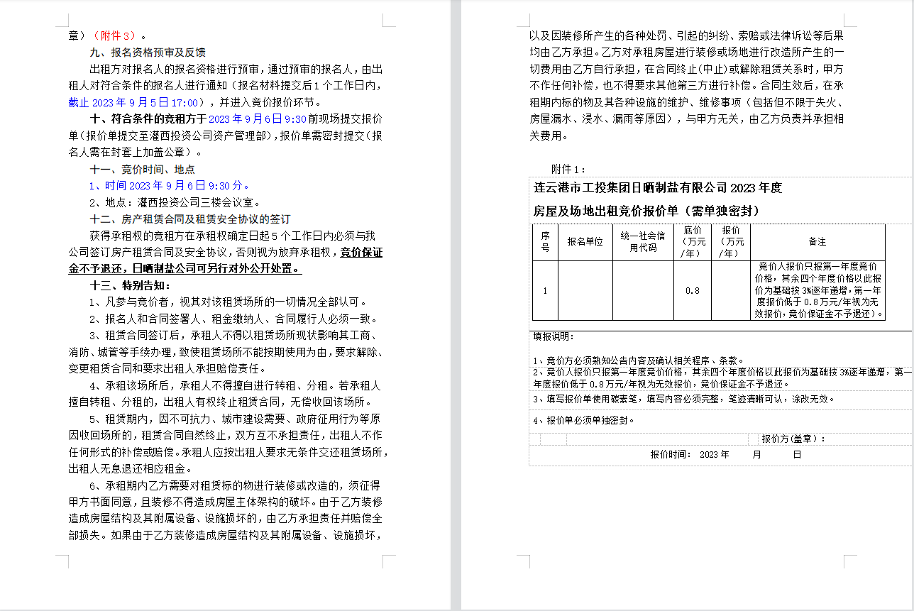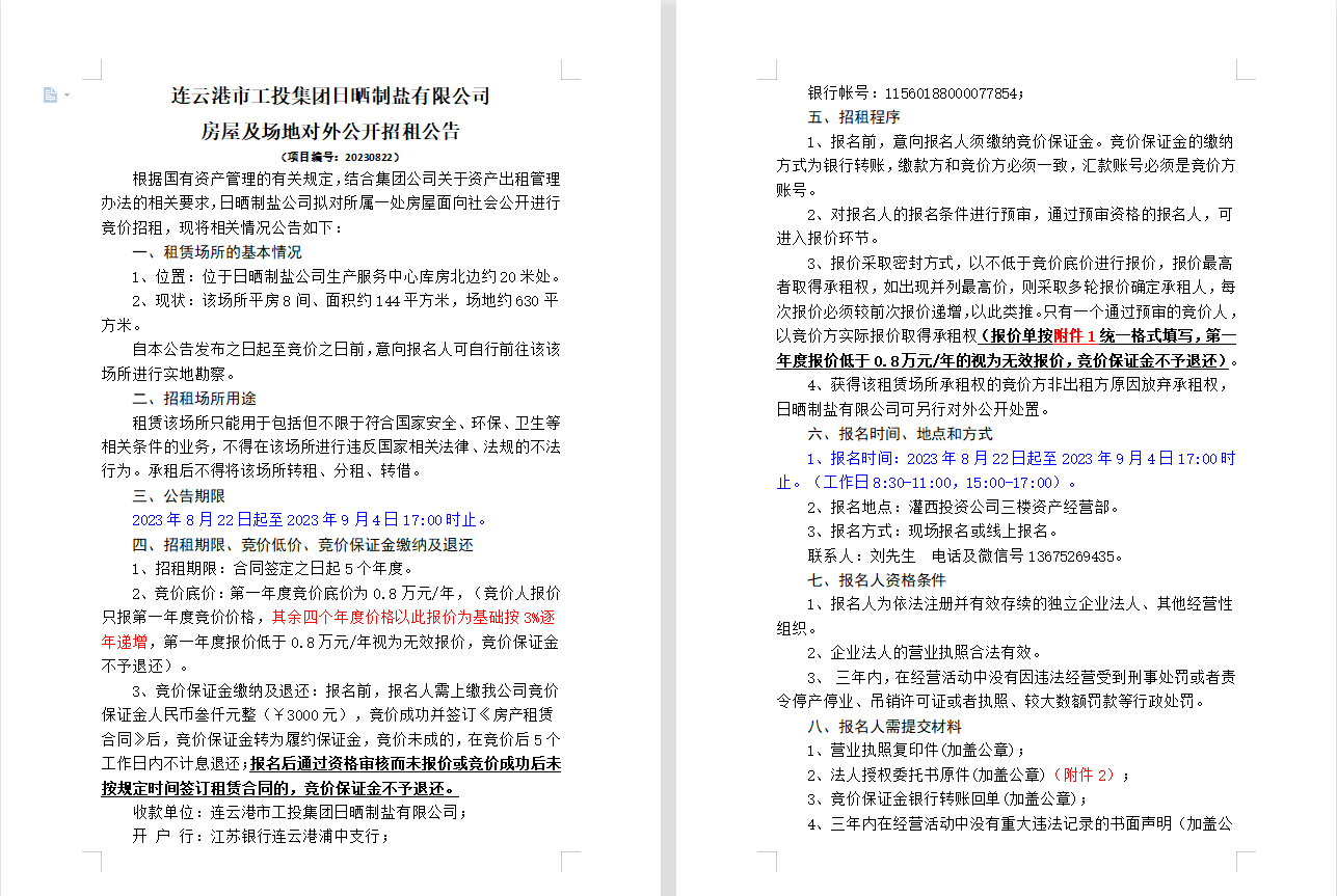 連云港市工投集團日曬制鹽有限公司 房屋及場地對外公開招租公告