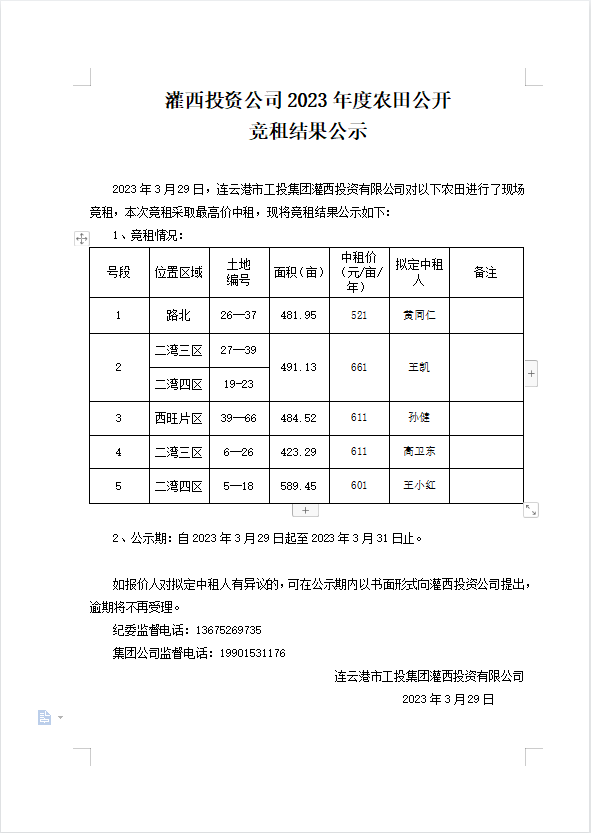 灌西投資公司2023年度農田公開 競租結果公示