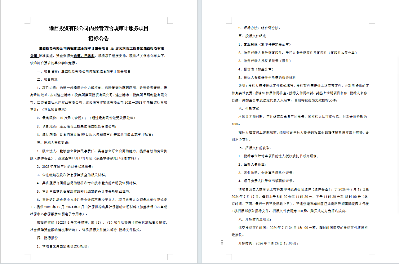 灌西投資有限公司內控管理合規審計服務項目招標公告