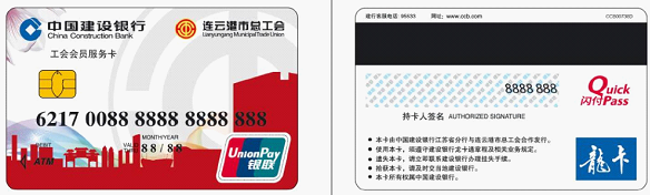 工會(huì)會(huì)員服務(wù)卡是一張集工會(huì)會(huì)員身份識(shí)別功能、會(huì)員服務(wù)功能于一體的工會(huì)會(huì)員實(shí)名服務(wù)卡。具體功能如下: (一)身份識(shí)別功能。工會(huì)會(huì)員服務(wù)卡具有工會(huì)會(huì)員身份識(shí)別功能,記載工會(huì)會(huì)員基本信息,全市工會(huì)會(huì)員實(shí)名制動(dòng)態(tài)管理。 (二)工會(huì)服務(wù)功能。工會(huì)會(huì)員服務(wù)卡具有劃入存貯工會(huì)所有幫扶救助資金的服務(wù)功能,持卡會(huì)員還可免費(fèi)或優(yōu)惠享受工會(huì)組織提供的困難幫扶、職業(yè)介紹、技能培訓(xùn)、心理咨詢、勞動(dòng)爭(zhēng)議調(diào)解等服務(wù)。 (三)金融服務(wù)功能。工會(huì)會(huì)員服務(wù)卡具有銀行借記卡的所有功能。 (四)社會(huì)服務(wù)功能。工會(huì)會(huì)員服務(wù)卡整合部分社會(huì)服務(wù)功能,通過(guò)工會(huì)與加盟機(jī)構(gòu)合作,為持卡會(huì)員提供醫(yī)療保健、文化娛樂(lè)、商業(yè)購(gòu)物、生活服務(wù)等領(lǐng)域的優(yōu)惠服務(wù)。(具體簽約單位見(jiàn)市總工會(huì)網(wǎng)站www.lygzgh.org/ka/) 下圖為工會(huì)會(huì)員服務(wù)卡卡樣,連云港市總工會(huì)發(fā)行的工會(huì)會(huì)員服務(wù)卡只此一種設(shè)計(jì),請(qǐng)認(rèn)準(zhǔn)連云港市總工會(huì)logo和工會(huì)會(huì)員服務(wù)卡字樣,若同此圖不同均非工會(huì)會(huì)員服務(wù)卡。