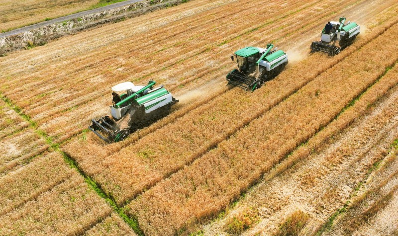 6月8日,在青口投資公司大新農場鹽堿地種植區,小麥一片金黃,麥穗顆粒飽滿,收割機在麥田里來回穿梭加緊搶收小麥。