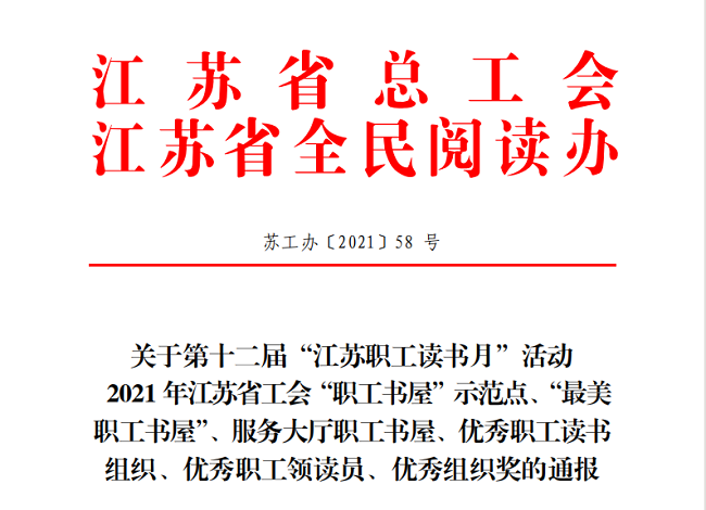 近日,江蘇省總工會(huì)、江蘇省全民閱讀辦聯(lián)合下發(fā)《關(guān)于第十二屆“江蘇職工讀書月”活動(dòng)通報(bào)》(蘇工辦【2021】58號(hào))文中,我公司職工書屋獲評(píng)2021年度江蘇省工會(huì)“職工書屋”示范點(diǎn),同時(shí)獲贈(zèng)圖書近200冊。