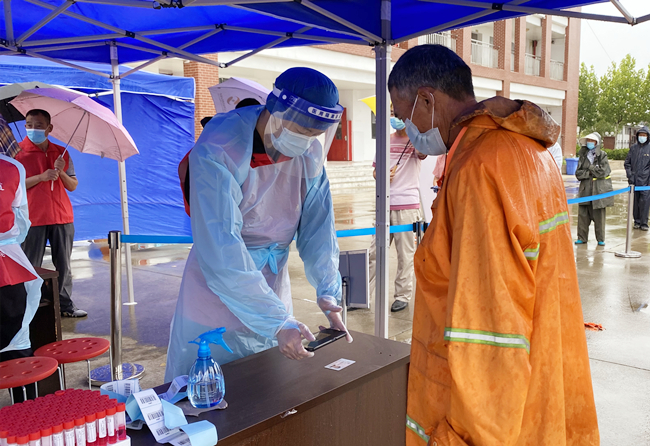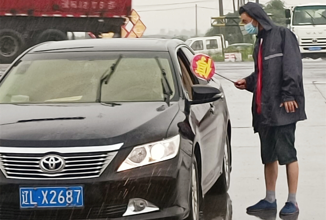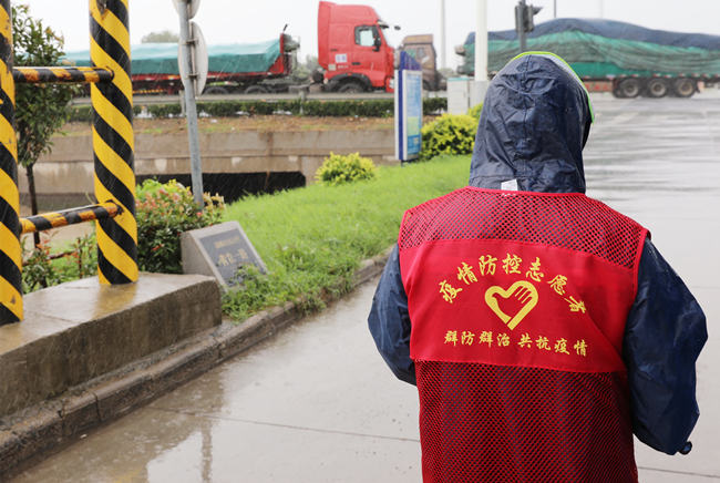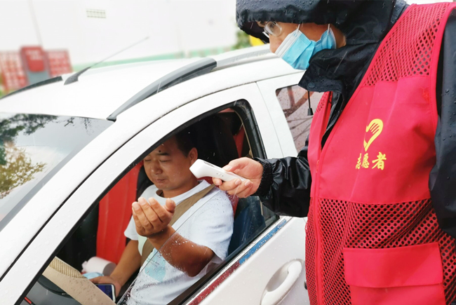 “您好,請出示一下行程碼,做下登記?!眻允卦趰徫唬骘L迎雨,對車輛進行逐一登記和體溫檢查,絲毫沒有受天氣的影響。
