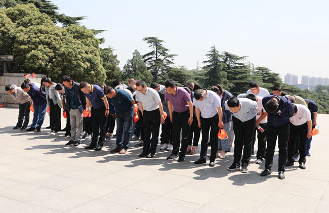 在烈士紀念塔前,公司黨委副書記梁永帶領全體黨員向淮海戰役烈士敬獻花籃,并三鞠躬。