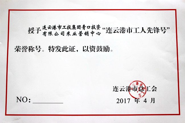 近日,公司米業營銷中心在連云港市總工會組織的 “2017年度連云港市工人先鋒號”評選活動中,被授予“工人先鋒號”榮譽稱號。