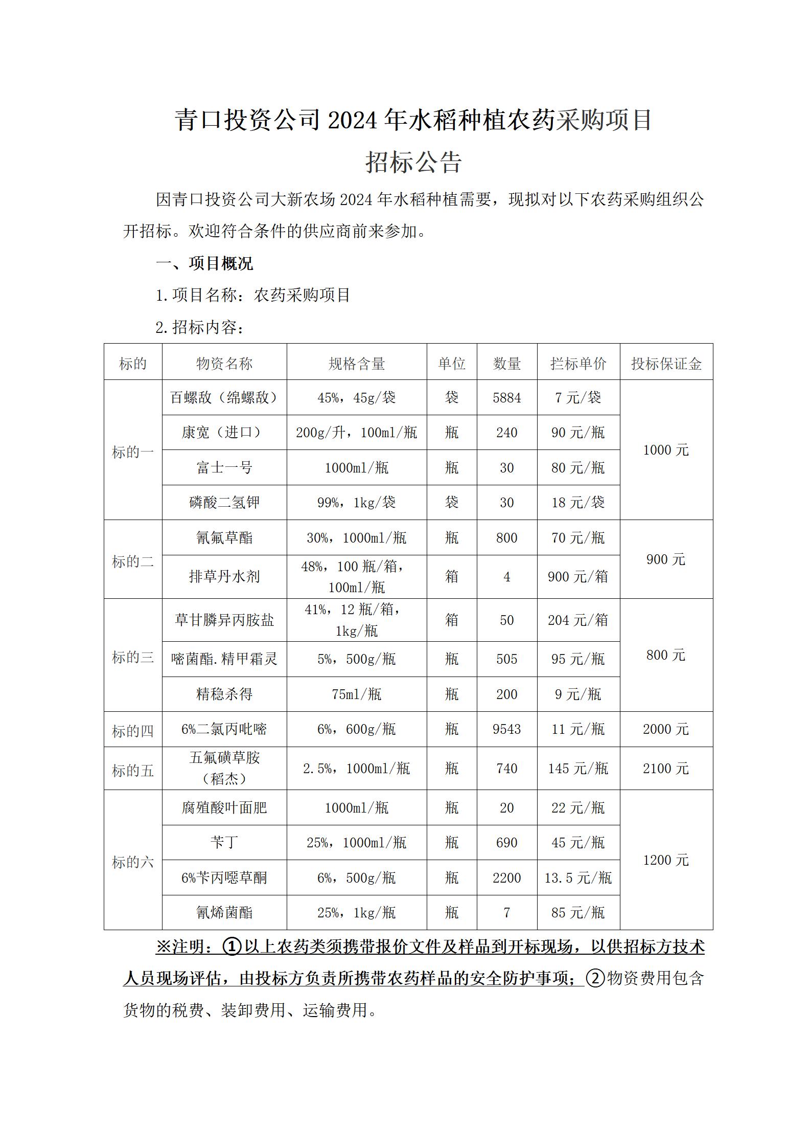 青口投資公司2024年水稻種植農(nóng)藥采購項(xiàng)目 招標(biāo)公告