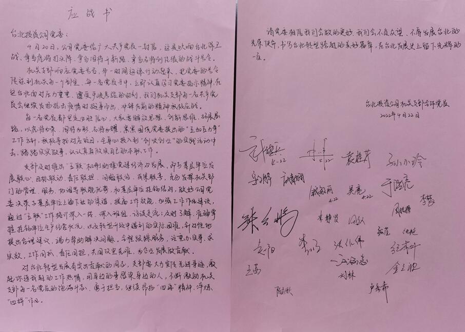 【給黨委回封信】機關全體黨員簽名應戰書