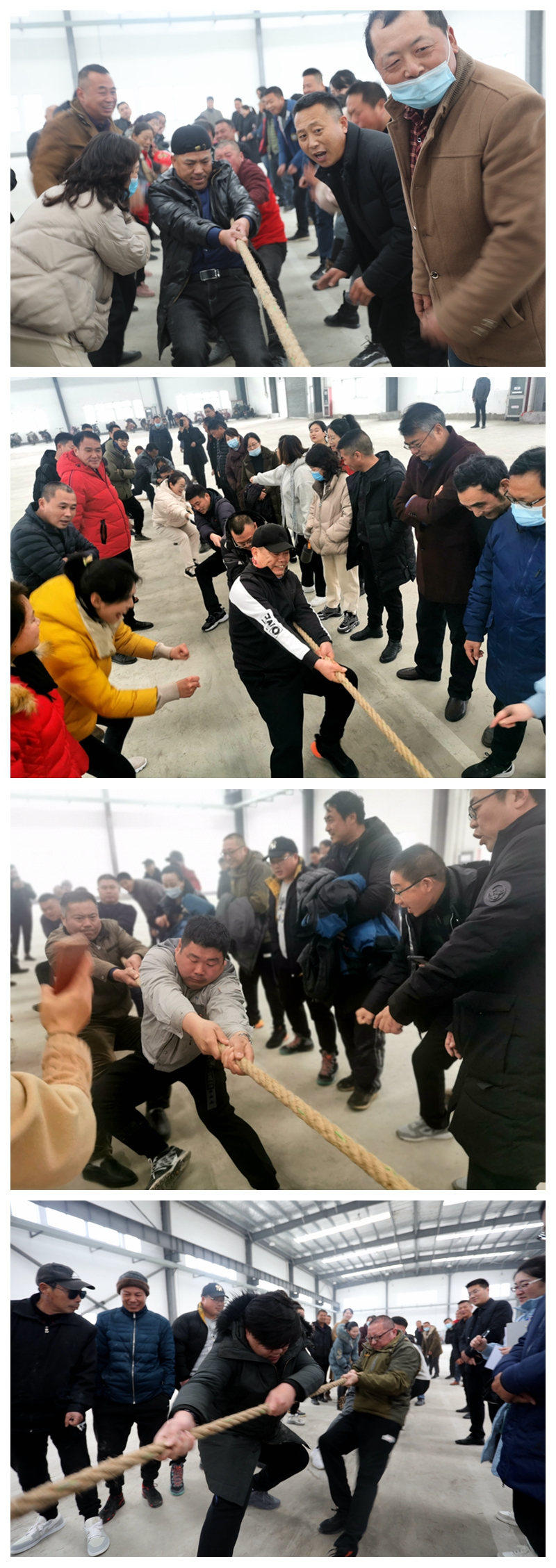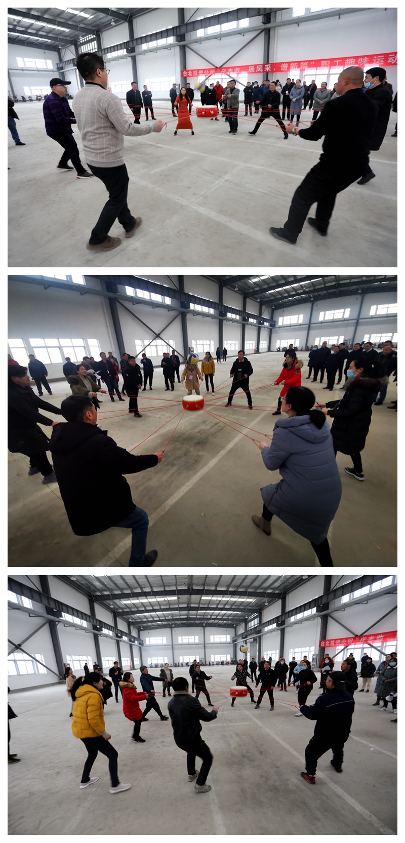 陽光熹微,冬日似金。為喜迎2021年新年的到來,大力弘揚團結拼搏,昂揚向上、奮發(fā)有為的精神風貌,營造生動活潑、寬松和諧、積極健康的良好氛圍,1228日下午,投資公司在海州灣公司9號廠房舉辦“慶豐收、展風采、譜新篇”迎元旦職工趣味運動會。本次趣味運動會分為拔河、同心擊鼓、企鵝漫步、快樂點球等四個項目,分為兩天舉行,本日舉行拔河、同心擊鼓兩項比賽。