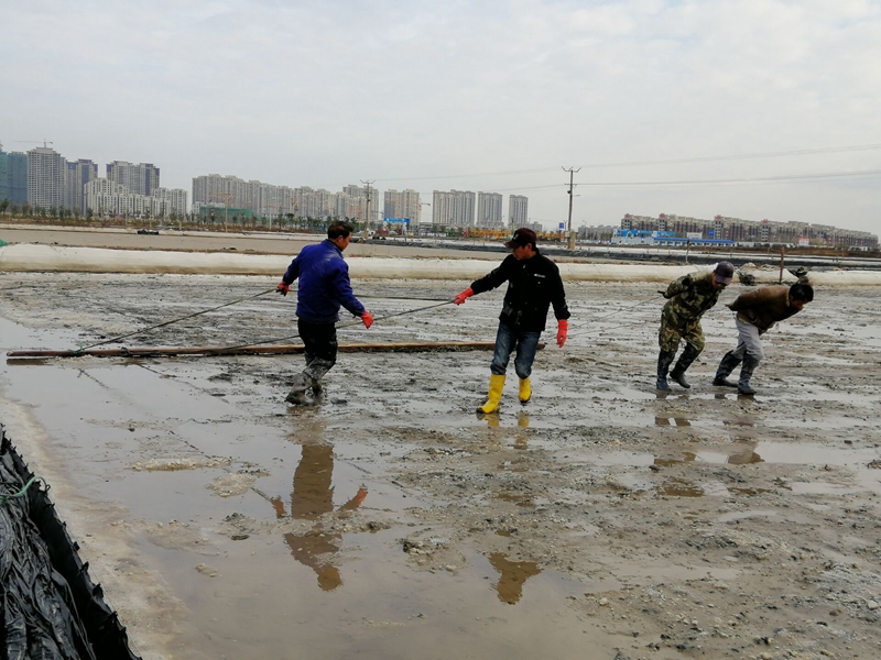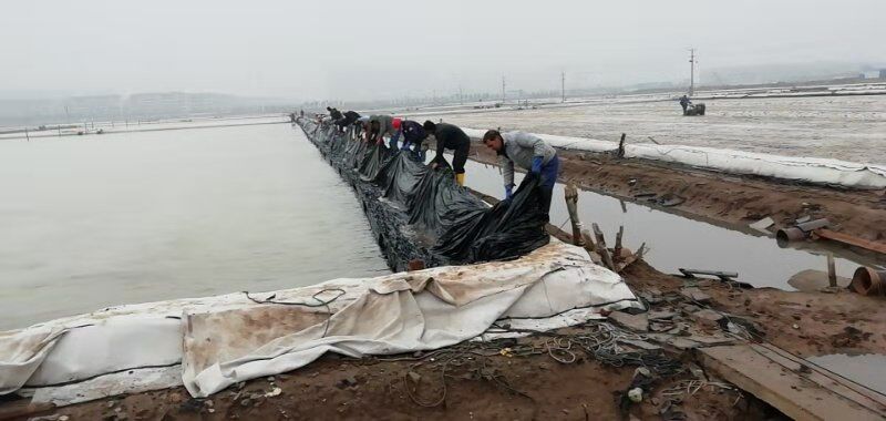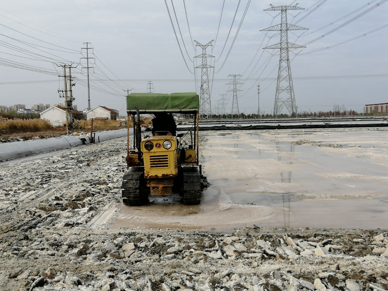 由于勞動力較為缺乏,人工扒鹽分為兩個班次白班和小夜班。工人們在完成各自班次任務的同時,還要承擔起后期繁瑣的相關工作。例如:扒鹽前要將塑池內的塑布整理、收縮到位、用活碴機對準備要扒格塊進行活碴、成廩后對鹽廩全面覆蓋、并抽出專人對大夜班空檔期電纜線及機電設備進行看管等等。其中池板整理是一項緊急活,扒完鹽后鹵水要緊跟著進池,小夜班的人下班后有時只睡幾個小時,早上7點多就來到灘頭整理池板,為抓緊灌池爭分奪秒爭。