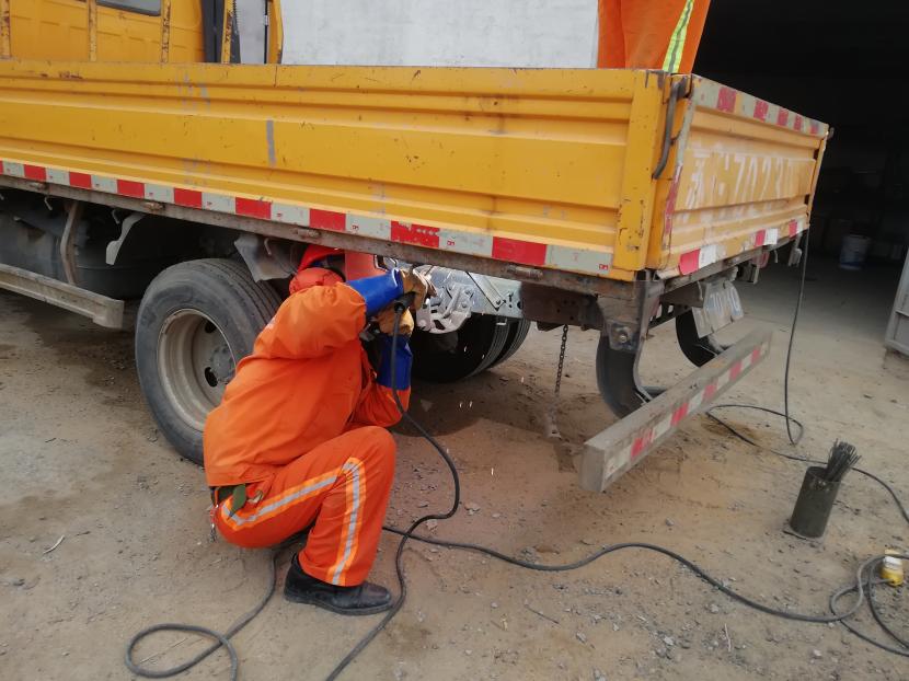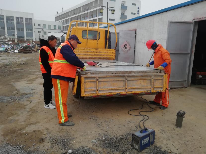 19日上午,經(jīng)過該公司設(shè)備維修班組再三斟酌,考慮如送修理廠維修,不但產(chǎn)生一筆不小的維修費(fèi)用,而且等待維修過程時間較長,影響工作進(jìn)度,為能給公司節(jié)省開支和不影響工作進(jìn)度,維修人員量好車廂底板尺寸后,將鐵板切割出需要的尺寸,一塊塊拼湊起來,加固在車廂底板上,通過半天的時間,順利為工具車底板披上一層合身、漂亮又特別的“盔甲”,有效延續(xù)了它的使用壽命。