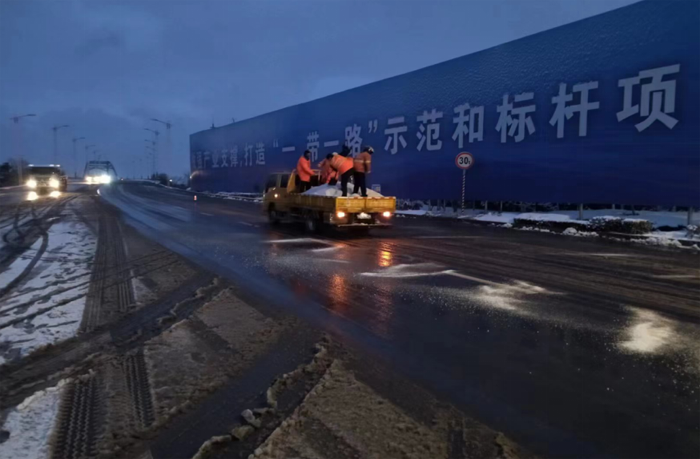 此次掃雪除冰行動共40余人參與,調(diào)派鏟雪車、裝載機等機械設(shè)備5臺,調(diào)用融雪劑30余噸,采用人機結(jié)合方式,對主要干道人行便道、交叉路口等重要地段的路面冰雪進行人工突擊清理;對所轄干道的橋面采用先雪鏟車清理,后鋪灑融雪劑相結(jié)合融化冰雪,循環(huán)進行。