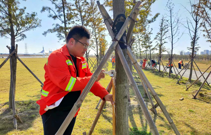 綠化衛士為樹木披上“防寒衣”
