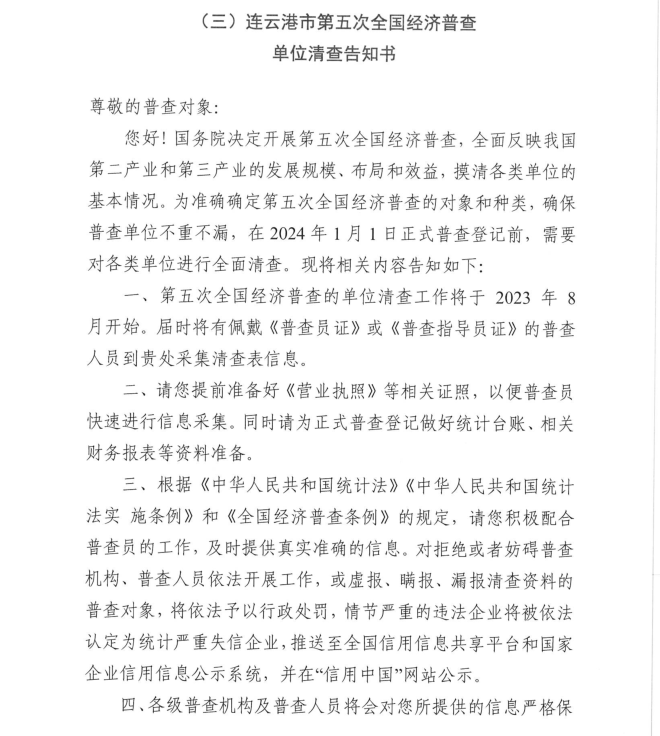按照《全國經濟普查條例》規定,國務院決定于2023年開展第五次全國經濟普查,為提高經濟普查質量,進一步推進普查工作順利開展,公司按照上級第五次全國經濟普查宣傳動員工作要求,現將《連云港市第五次全國經濟普查單位告知書》公示如下: